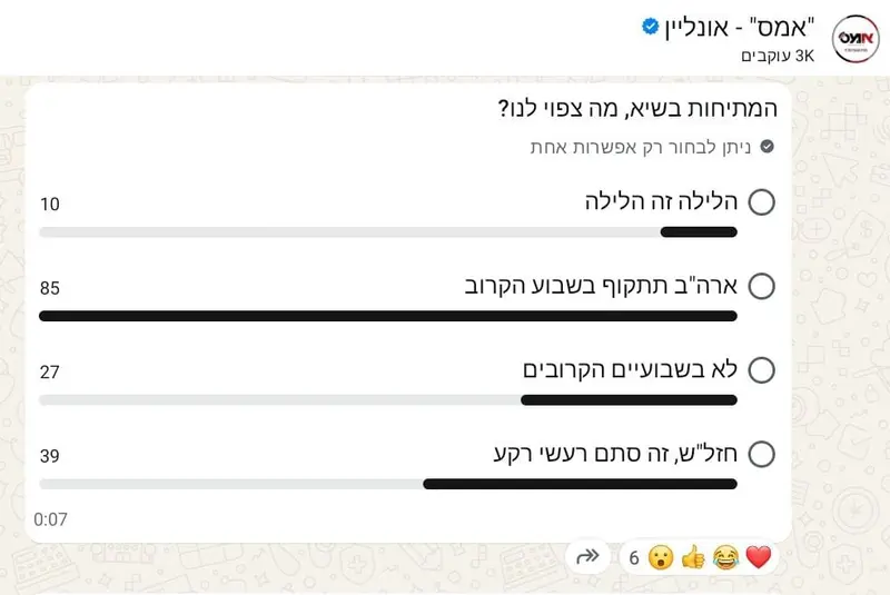 בימים של חוסר ודאות הציבור מחפש תשובות ולפעמים משקף את התחושות שלו דרך הרשתות החברתיות. הלילה עלה סקר מסקרן בערוץ 'אמס אונליין', בו חברים כבר למעלה מ-3,600 עוקבים, שניסה למדוד את דופק הקוראים תחת השאלה הישירה המתיחות בשיא, מה צפוי לנו?.