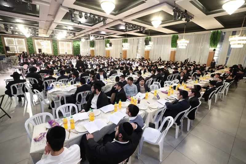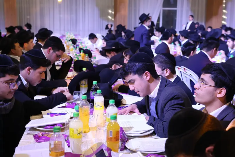 תחילה התכנסו מאות בני הישיבות יחד עם רבותיהם ראשי הישיבות הקטנות לסדר לימוד בסוגיית "העוסק במצווה פטור מן המצווה", כשלצידם חוברת מיוחדת עם מראי מקומות בסוגיא זו ואף מקום לכתוב את הערותיהם בסוגיא, כאשר הבחורים מצפון ומדרום ממזרח וממערב מתפלפלים יחד בלימוד בסדר שנמשך כשעתיים. מחזה שגרם להתרגשות גדולה לראות את אולם השמחות נהפך למרקחה של תורה.
