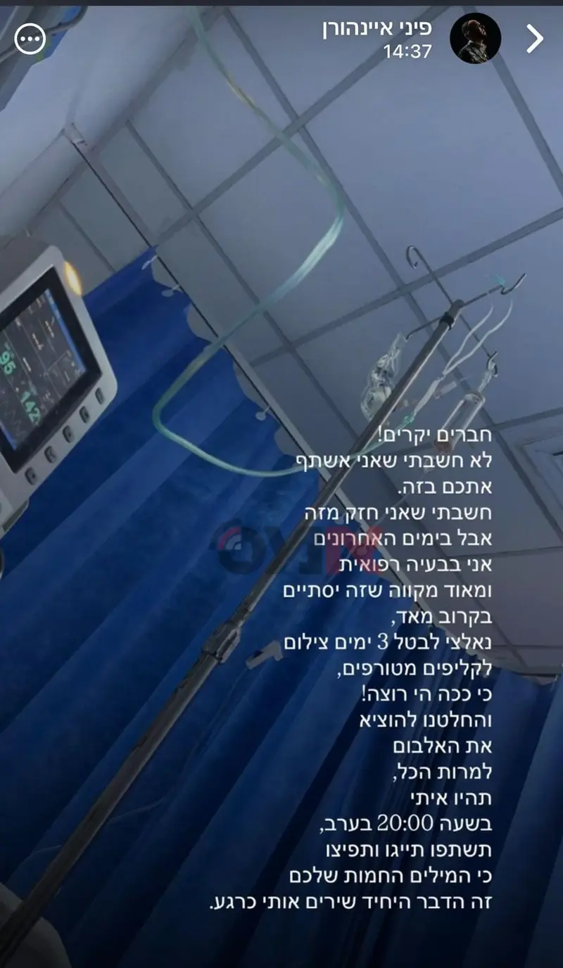איינהורן, שנחשב לאחד האמנים המבוקשים והאהובים בזכות השילוב הייחודי שבין רגש עמוק לשמחה מתפרצת, סיפר כי המצב אילץ אותו לבטל שלושה ימי צילומים מתוכננים לקליפים חדשים. בפוסט המרגש כתב הזמר: "חשבתי שאני חזק מזה אבל בימים האחרונים אני בבעיה רפואית ומאוד מקווה שזה יסתיים בקרוב מאד".