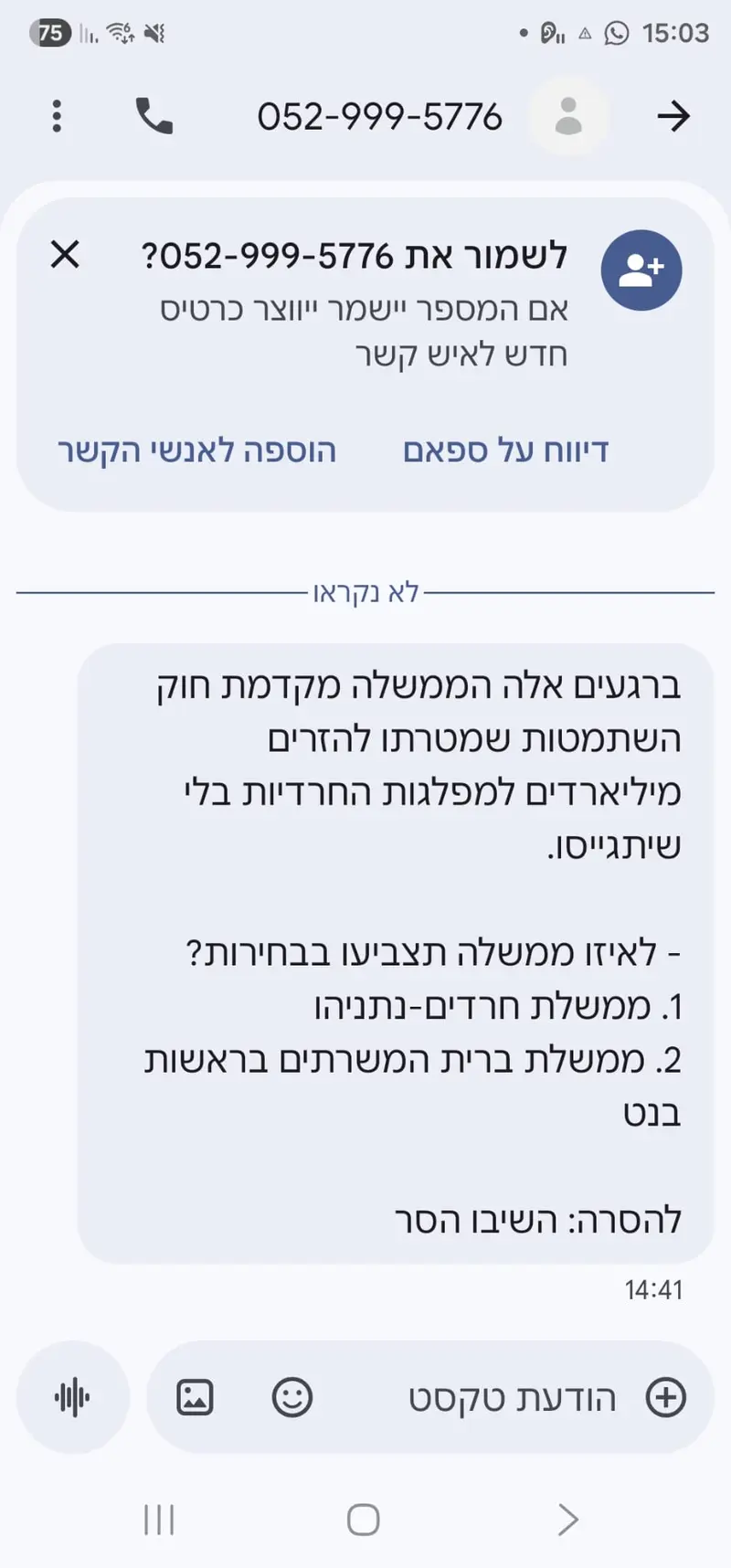 נוסח ההודעה שנשלח למכשירים הסלולריים אינו משתמע לשני פנים: "ברגעים אלה הממשלה מקדמת חוק השתמטות שמטרתו להזרים מיליארדים למפלגות החרדיות בלי שיתגייסו. לאיזו ממשלה תצביעו בבחירות? 1. ממשלת חרדים-נתניהו. 2. ממשלת ברית המשרתים בראשות בנט". המסר החד והמפלג מבקש להציב את הבוחר בפני ברירה בינארית, תוך שימוש במונחים מפלגים, מסיתים ומשסים מגזר במגזר.