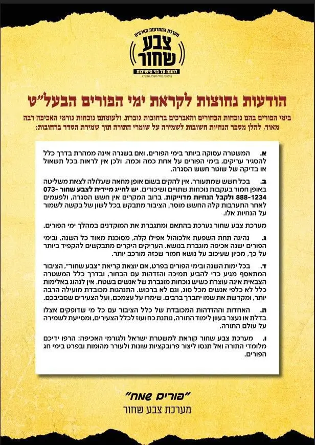 לקראת ימי הפורים ובצל גזירת הגיוס המרחפת מעל עולם הישיבות, פורסמו ביממה האחרונה הנחיות מיוחדות מטעם מערכת ההתרעות הארצית צבע שחור. המערכת, הפועלת להגנה על בני הישיבות ע"י מחאות ספונטניות כאשר המשטרה הצבאית מנסה לעצור בחור, פרסמה מודעות תחת הכותרת הודעות נחוצות לקראת ימי הפורים הבעל"ט.