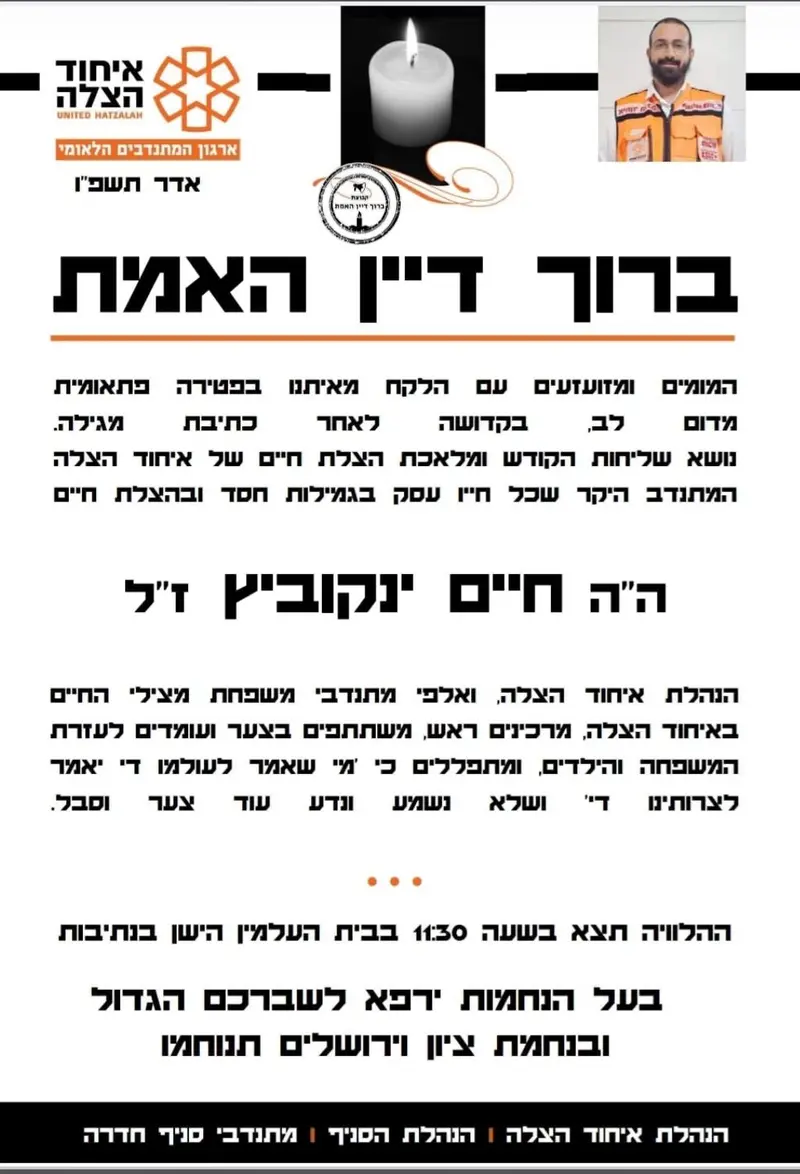 הלם ותדהמה בעיר חדרה, בקהילת חסידי חב"ד, בארגוני החסד זק"א ואיחוד הצלה, בעקבות פטירתו הפתאומית ביום שישי ערב שבת זכור – של הרה"ח ר' חיים ינקוביץ ז"ל, בן 41 בלבד.
