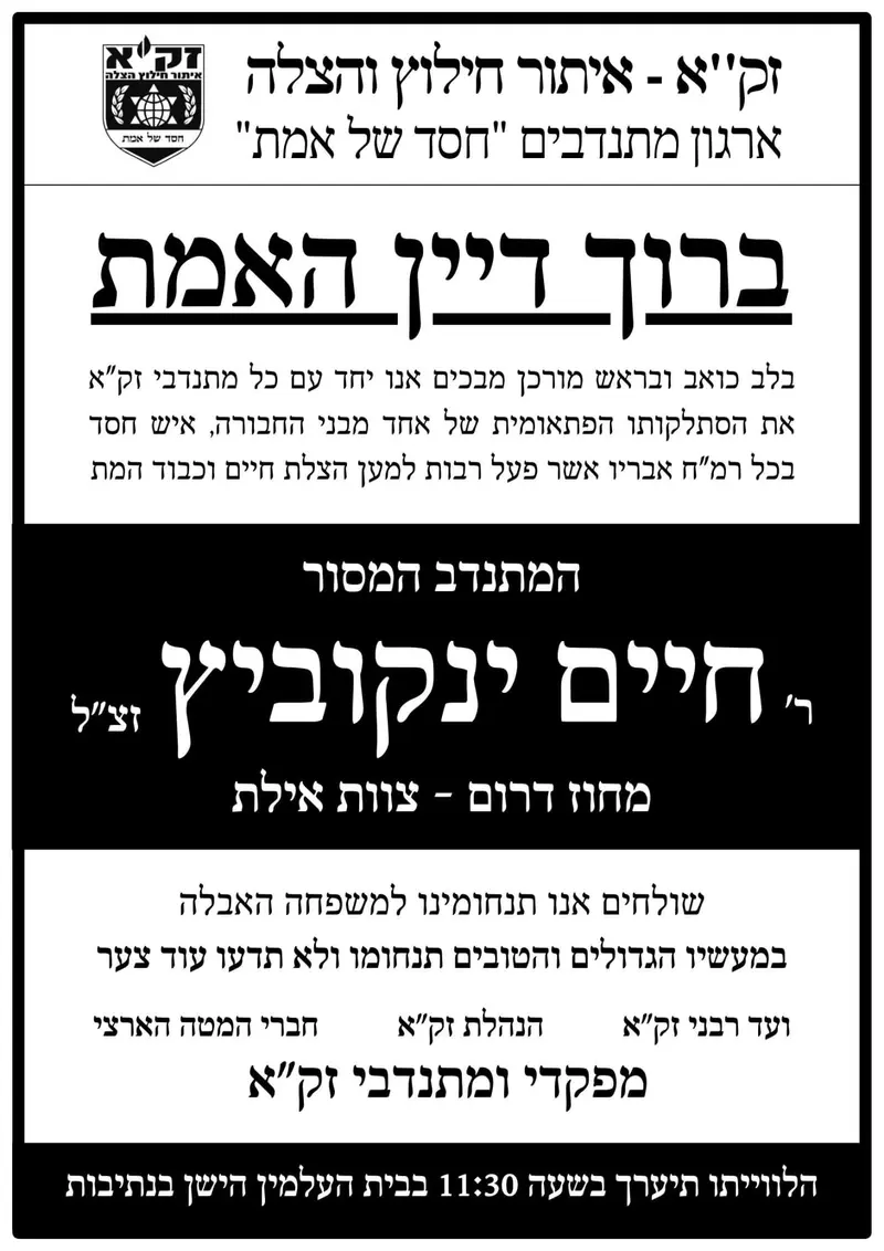 ינקוביץ ז"ל, שנולד בנתיבות למשפחת מחנכים מוכרת, הקדיש את חייו למלאכת הקודש של חסד של אמת והצלת חיים. עד לפני כשנתיים פעל באילת, שם הפך לאחד מעמודי התווך של צוות זק"א המקומי. מפקדיו וחבריו מספרים על אדם שפעל בענווה וברגישות יוצאת דופן, שתמיד היה מהראשונים להתייצב בכל זירה – ביום, בלילה ובכל תנאי – כדי לשמור על כבוד המת ולסייע למשפחות בשעתן הקשה ביותר.