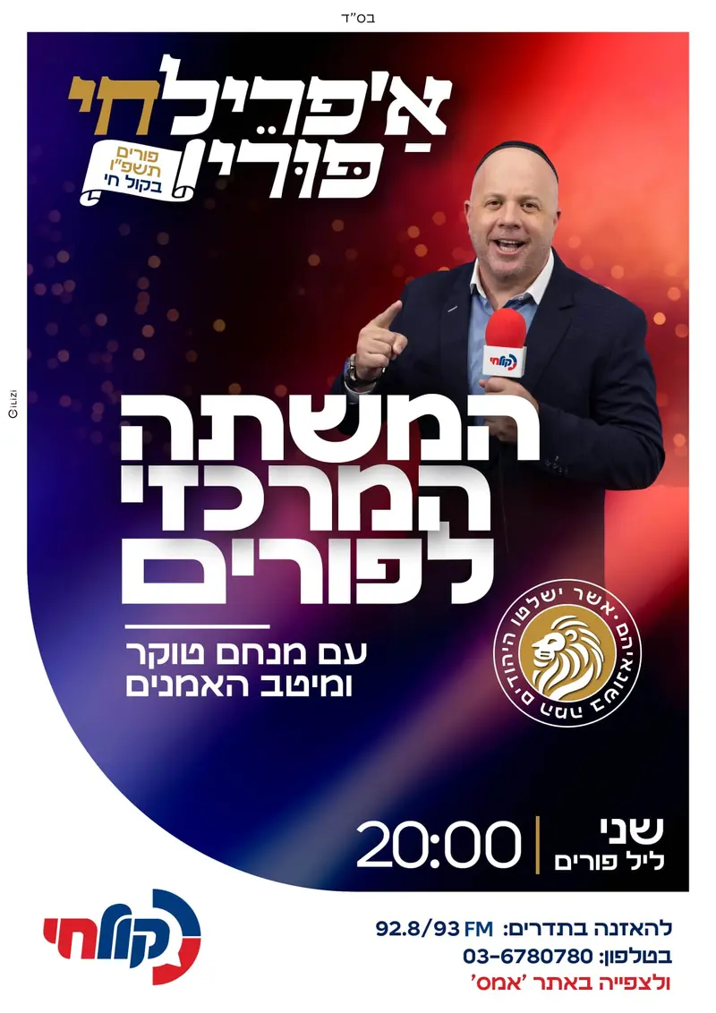 המשדר החגיגי, שיועבר ברדיו ובוידאו במקביל, נועד להביא את אווירת החג והשמחה היישר אל תושבי ארץ הקודש הנמצאים תחת איום קיומי – כמו בימים ההם גם בזמן הזה. מנחם טוקר רקח עבור המאזינים והצופים תוכנית עשירה במיוחד, שמטרתה להרים את המורל ברגעים מאתגרים אלו ולהבטיח ששמחת הפורים לא תיפגע.