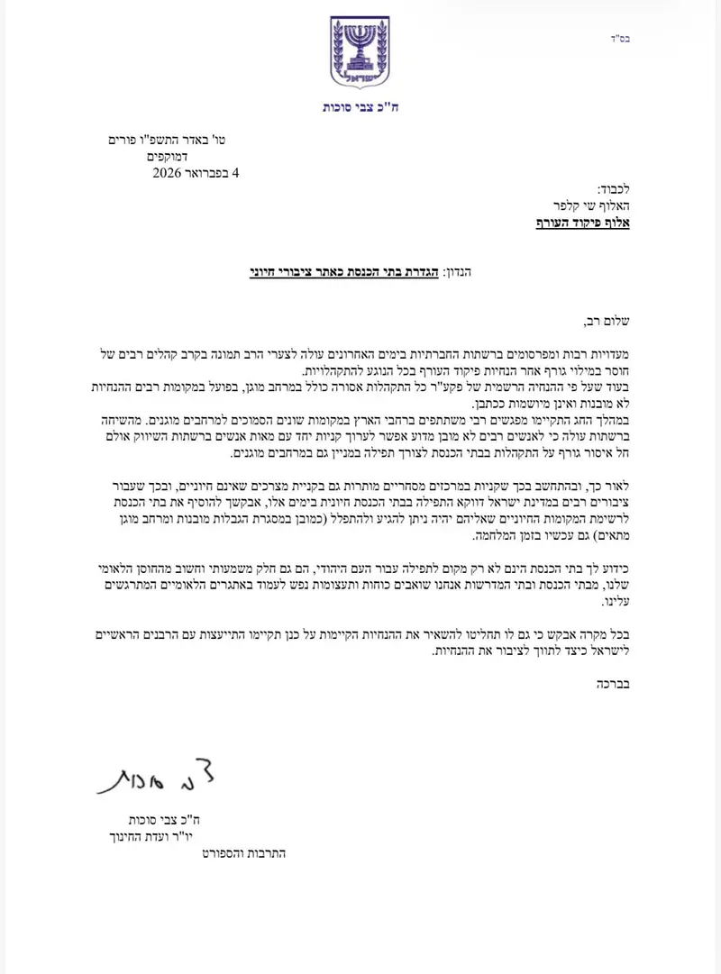 יו"ר ועדת החינוך, ח״כ צבי סוכות, שיגר מכתב לאלוף פיקוד העורף שי קלפר בדרישה להגדיר את בתי הכנסת כאתר ציבורי חיוני במסגרת ההנחיות לשעת החירום, דבר שיאפשר הגעה לתפילה במניין בכפוף למגבלות ולשהייה במרחב מוגן.