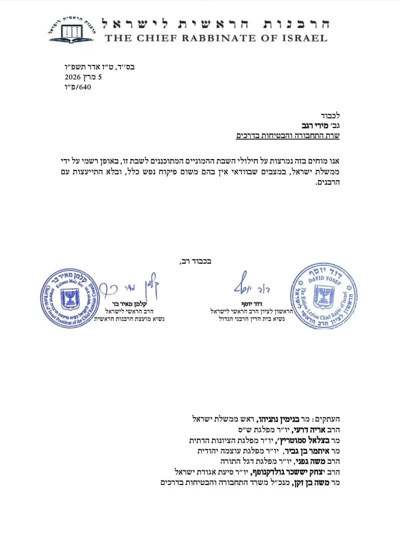 הרבנים הראשיים לישראל, הראשון לציון הגאון הרב דוד יוסף ונשיא מועצת הרבנות הראשית הגאון הרב קלמן מאיר בר, שיגרו מכתב נוקב לשרת התחבורה מירי רגב. במכתבם מביעים הרבנים מחאה תקיפה נגד חילולי השבת המתוכננים במסגרת הפעלת מערך התחבורה הממשלתי במהלך יום השבת.