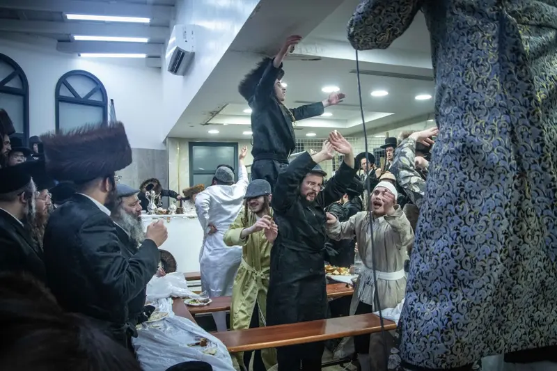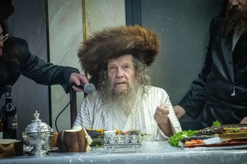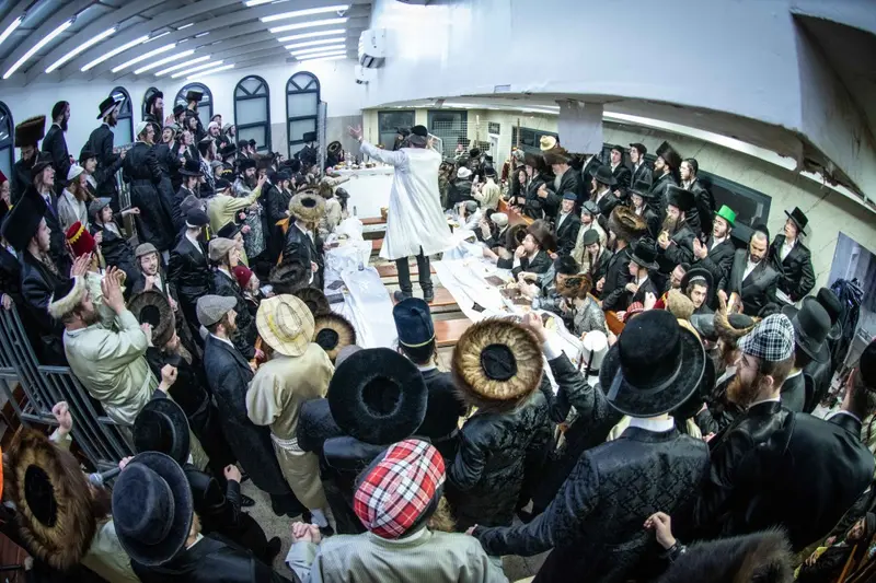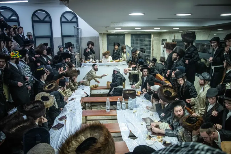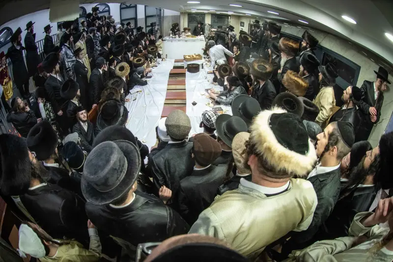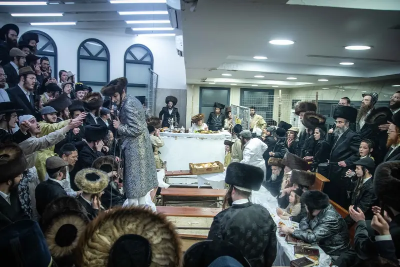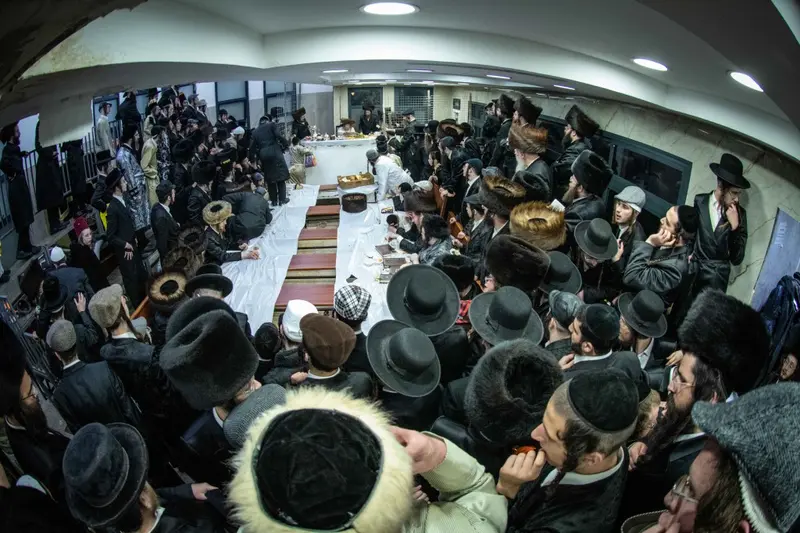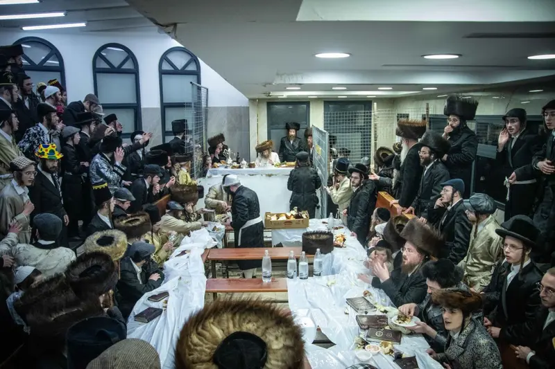 תיעוד מטיש פורים בבית מדרשו של האדמו"ר השרף מלעלוב ניקלשבורג בבית מדרשו ברחוב כפר נחום בירושלים. אמן הרגש מוטי שטיינמץ שהשתתף בטיש עלה השולחן ורקד מול האדמו"ר.