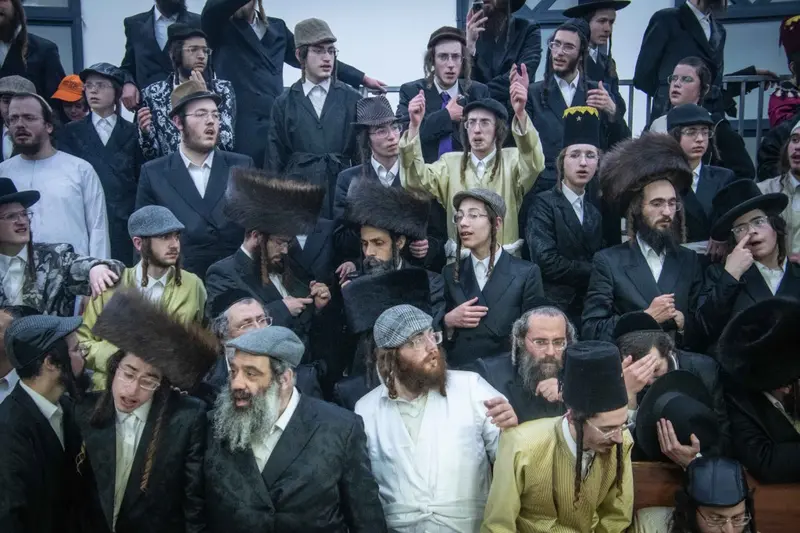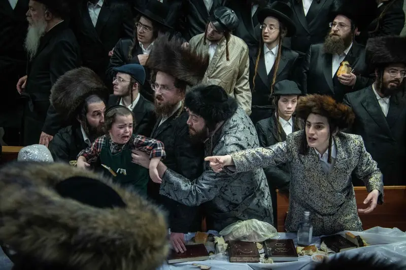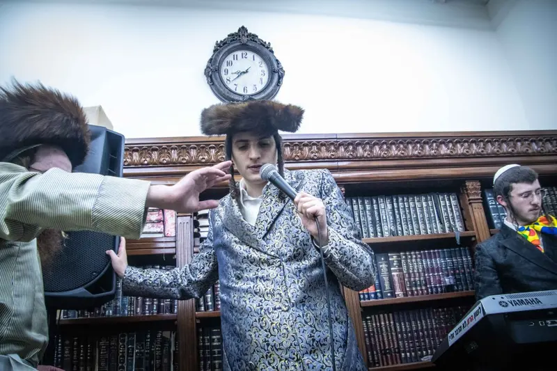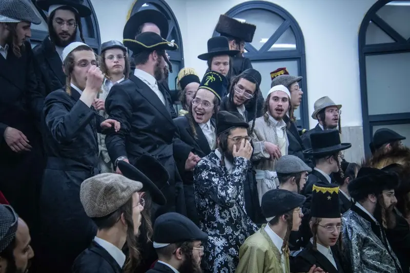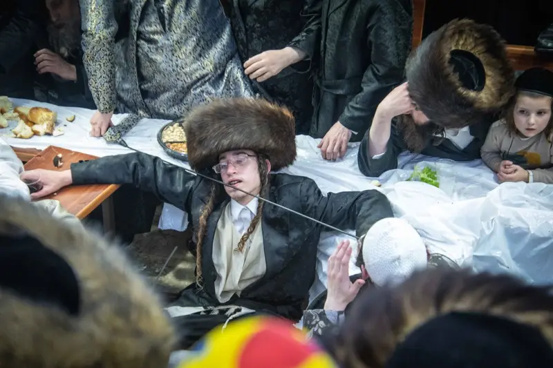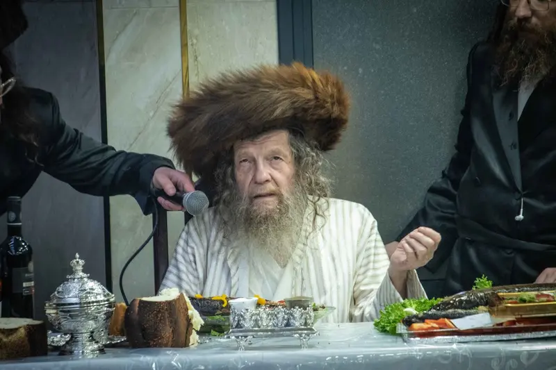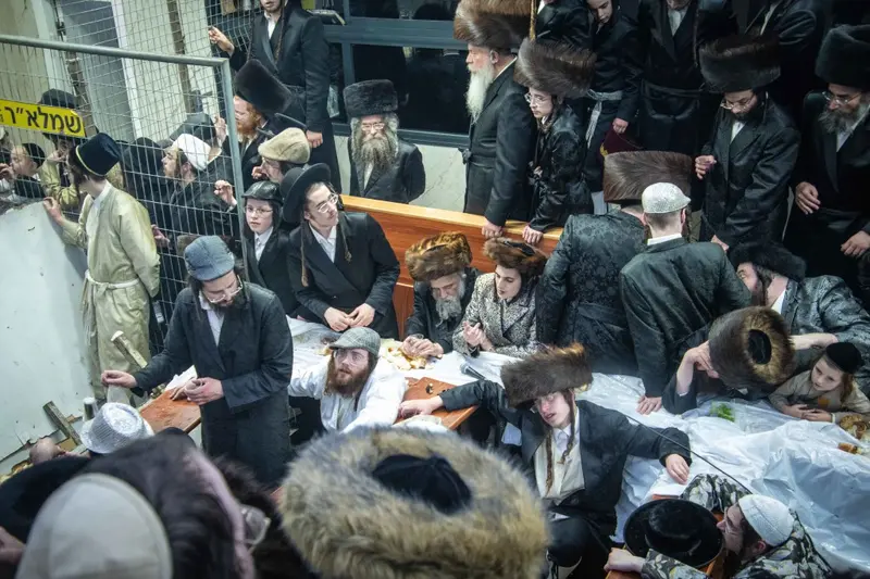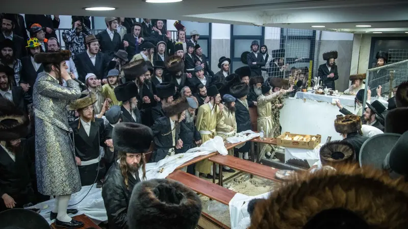 תיעוד מטיש פורים בבית מדרשו של האדמו"ר השרף מלעלוב ניקלשבורג בבית מדרשו ברחוב כפר נחום בירושלים. אמן הרגש מוטי שטיינמץ שהשתתף בטיש עלה השולחן ורקד מול האדמו"ר.