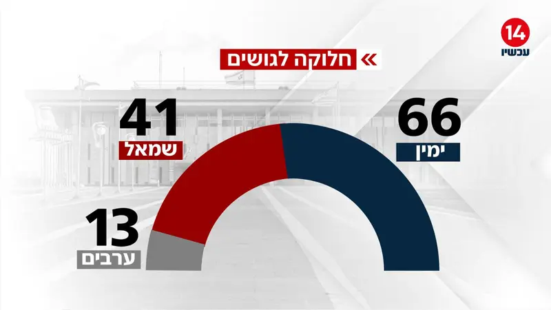 חלוקת הגושים מצביעה על יתרון ברור לימין: 66 מנדטים לגוש הימין, לעומת 41 לגוש השמאל ו-13 מנדטים למפלגות הערביות.