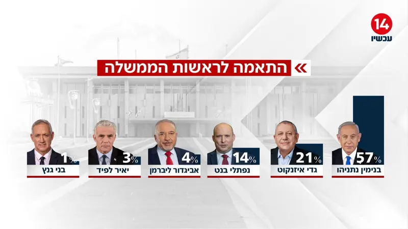 בשאלת ההתאמה לראשות הממשלה מוביל נתניהו בפער משמעותי. לפי הסקר, 57% מהנשאלים סבורים כי הוא המתאים ביותר לתפקיד. אחריו ניצב גדי איזנקוט עם 21%, ולאחר מכן נפתלי בנט עם 14%. אביגדור ליברמן מקבל 4% תמיכה, יאיר לפיד 3% ובני גנץ 1% בלבד. הסקר נערך היום, 5 במרץ 2026, בקרב 742 נשאלים מהאוכלוסייה הבוגרת בישראל.
