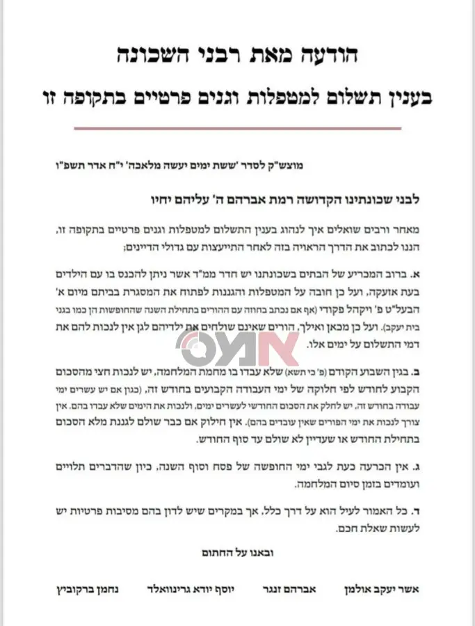 הרבנים הוסיפו כי אין צורך לנכות מהתשלום את ימי חופשת הפורים שבהם ממילא אין לימודים וכי "אין חילוק אם כבר שולם לגננת סכום מלא בתחילת החודש או שעדיין לא שולם עד סוף החודש". לגבי ימי החופשה המתוכננים של פסח וסוף השנה הובהר כי "הדברים תלויים ועומדים בזמן סיום המלחמה" והחלטה בעניינם תתקבל בהמשך. על המכתב חתומים רבני השכונה הרב אשר יעקב אולמן הרב אברהם זונגר הרב יוסף יודא גרינוואלד והרב נחמן ברקוביץ.