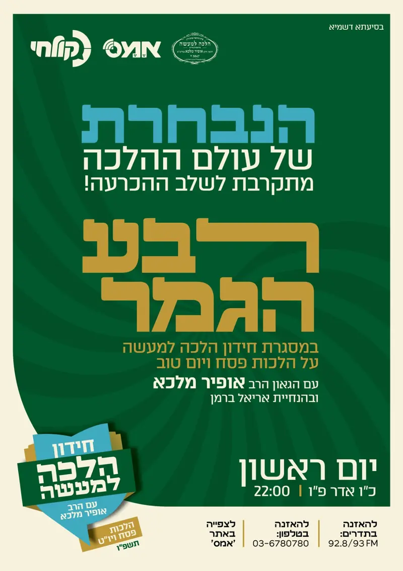 המתח בחידון "הלכה למעשה" מגיע לשיאו, כאשר הנבחרת המובחרת של עולם ההלכה מתקרבת לשלב ההכרעה הגורלי. שלב רבע הגמר, יתמקד בנושאים המורכבים והמעשיים של הלכות פסח ויום טוב.