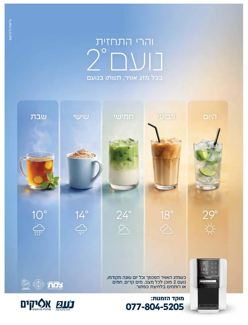 מולם, 'אפיקים' שוברת את הכללים עם מכשיר ה"נועם 2". הם הלכו על אסקפיזם טהור בסגנון תחזית מזג אוויר שמציגה קפה קר, כוסות מאצ'ה ומוחיטו – פנייה לקהל שרוצה קצת לייף-סטייל ופינוק אישי בתוך הלחץ.