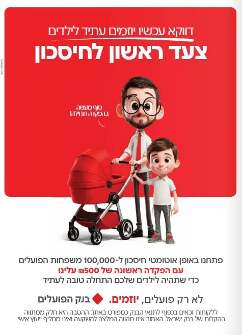 אחרי שכולם מדברים על הלוואות וכיבוי שריפות, מגיע 'בנק הפועלים', באמצעות משרד הפרסום 'גל-אורן-לרנר BSD', עם זווית אחרת לגמרי: חיסכון. הקמפיין מדבר על יוזמה לעתיד הילדים: פתיחה אוטומטית של חיסכון ל-100,000 משפחות, כשהבנק מפקיד את ה-500 שקלים הראשונים עליו. זה מסר חזק שאומר: למרות שעכשיו קשה, אנחנו חייבים לחשוב על המחר.
