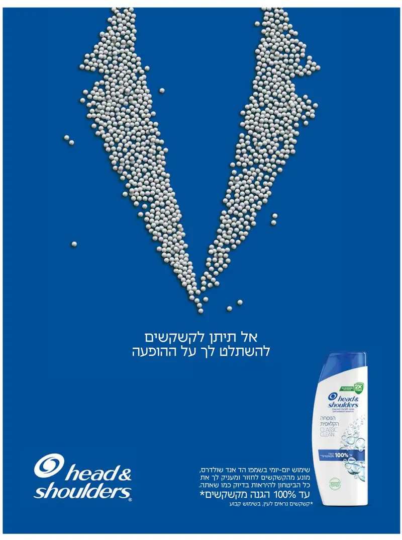 הקמפיין השני הוא שיחוק אמיתי עבור שמפו 'הד אנד שולדרס'. הם יצרו מודעה של צווארון חליפה שבנוי כולו מהמון קשקשים קטנים ובתשדיר הרדיו חבר מחמיא לחבר על החליפה ה"לבנה". כאחד שגם משתמש ב'הד אנד שולדרס' מאוד התחברתי.