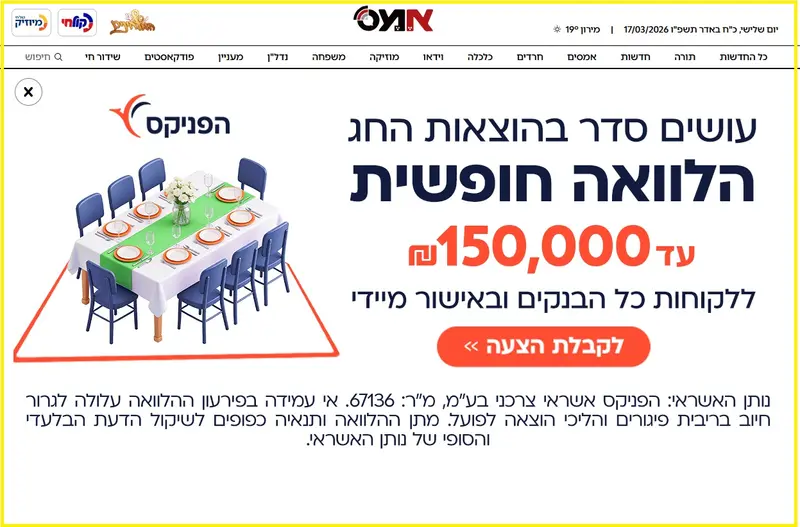 מיד אחריהם מגיעה חברת הפניקס, שלוקחת את הצורך בהלוואה וצובעת אותו באווירת החג, עם הלוואות חופשיות עד 150,000 שקלים ומסרים כמו "עושים סדר בהוצאות החג" או "החופש לשפץ את הבית לכבוד החג".