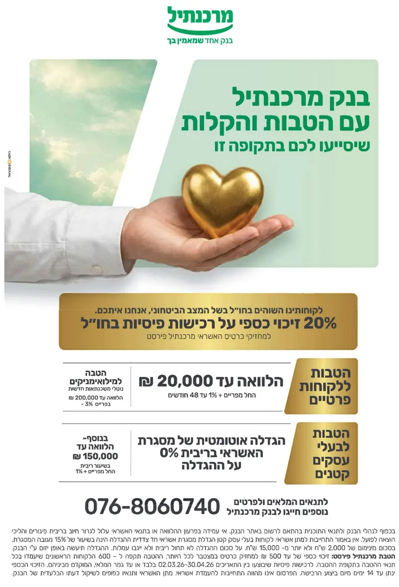 יש כמובן גם את המעגל של כולנו, שלא נפגעו פיזית, אבל מרגישים את זה בכיס. זה מכניס אותנו ישר לצד הכלכלי, כי יש היום חוסר בהירות עצום גם לשכירים וגם לעצמאים. אנחנו מתקרבים ל-5 או ל-10 לחודש, הימים שבהם המשכנתא או השכירות יורדת, וכמובן שיש את תשלומי כרטיסי האשראי והתשלומים השוטפים שחונקים את התקציב. בדיוק בגלל הלחץ הזה, 'בנק מרכנתיל' באמצעות משרד הפרסום 'בולטון-פוטנציאל' השיקו קמפיין שמציג מהלך אסטרטגי של הקלות: הלוואות בלון עד 100,000 שקלים ללא ריבית למי שביתו נפגע, ובמקביל הגדלה אוטומטית של מסגרת האשראי ב-0% ריבית לבעלי עסקים קטנים.