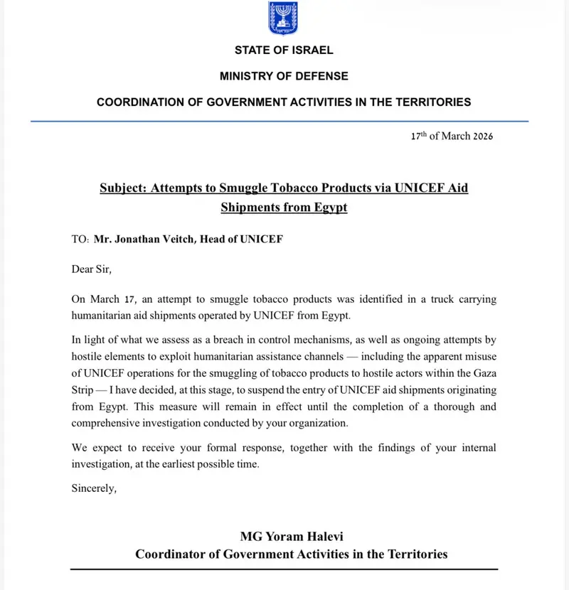 צעד חסר תקדים במערך הסיוע ההומניטרי: מתאם פעולות הממשלה בשטחים (מתפ"ש), האלוף יורם הלוי, הודיע היום (שלישי) לראש סוכנות UNICEF על השעיה מיידית של הכנסת משלוחי סיוע מטעם הארגון שמקורם במצרים. ההחלטה הדרמטית התקבלה לאחר שאנשי רשות המעברים במשרד הביטחון סיכלו ניסיון הברחה מתוחכם של מוצרי טבק וניקוטין, שהוסתרו בתוך משלוח שאמור היה להכיל ציוד הומניטרי חיוני.
