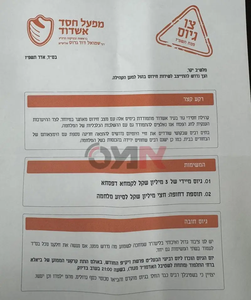 קהילת חסידות גור באשדוד פתחה בימים האחרונים במבצע גיוס כספים יוצא דופן לקראת חג הפסח – תחת הכותרת היצירתית "צו גיוס – שירות חירום למען הקהילה". המכתב, שנשלח לחברי הקהילה, מדמה זימון לשירות חובה, אך למעשה קורא להשתתפות במגבית רחבת היקף לטובת משפחות הזקוקות לסיוע.