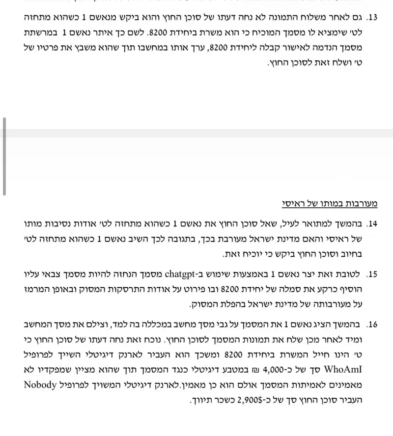כדי לבסס את אמינותו מול המודיעין האיראני, ביצע הנאשם פעולת התחזות מתוחכמת. הוא גנב פרטי זהות ותמונה של צעיר אחר והציג את עצמו כחייל המשרת ביחידת המודיעין 8200. באמצעות כלי בינה מלאכותית (AI), יצרו האחים מסמכים שנחזו להיות דוחות מודיעיניים בעלי אופי ביטחוני, ובכך יצרו מצג שווא של גישה לנתונים סודיים ביותר של מדינת ישראל.