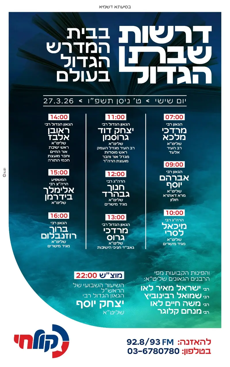ערב פסח ב'קול חי': החל ממחר בבוקר, ערב שבת פרשת צו, משדר מיוחד לאורך היום עם דרשות שבת הגדול מפי גדולי הרבנים.
