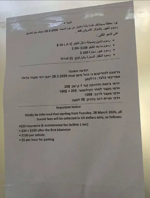 העלאת המחירים הדרסטית מגיעה בעיתוי רגיש במיוחד, כאשר שדות התעופה בישראל פועלים במתכונת מצומצמת עקב המצב הביטחוני והמערכה מול איראן וחיזבאללה. עבור משפחות רבות המעבר היבשתי לסיני היווה אלטרנטיבה זמינה וזולה לחופשה, אך תעריפי האגרה החדשים הופכים את היציאה מהארץ לנטל כלכלי כבד. על פי המודעה שפורסמה במעבר, התעריפים החדשים כוללים דמי ביטוח ותחזוקה בסך 20 דולר, דמי מעבר לרכב בסך 100 דולר ותשלום נוסף עבור כל קילומטר נסיעה מעבר לקילומטר הראשון.