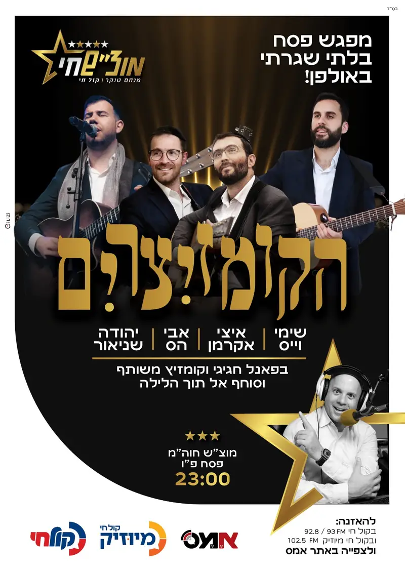 במרכז הערב יעמוד פאנל חגיגי בהשתתפות הרב איצי אקרמן, שימי וייס, אבי הס ויהודה שניאור – ארבעה מהיוצרים והמבצעים המזוהים ביותר עם תרבות הקומזיץ היהודי בעולם הישיבות והקעמפים. החבורה תגיש ביצועים חיים, קטעים משותפים ושיחות מאחורי הקלעים על היצירה, ההשראה והחיבור המוזיקלי המיוחד של ימי הפסח.