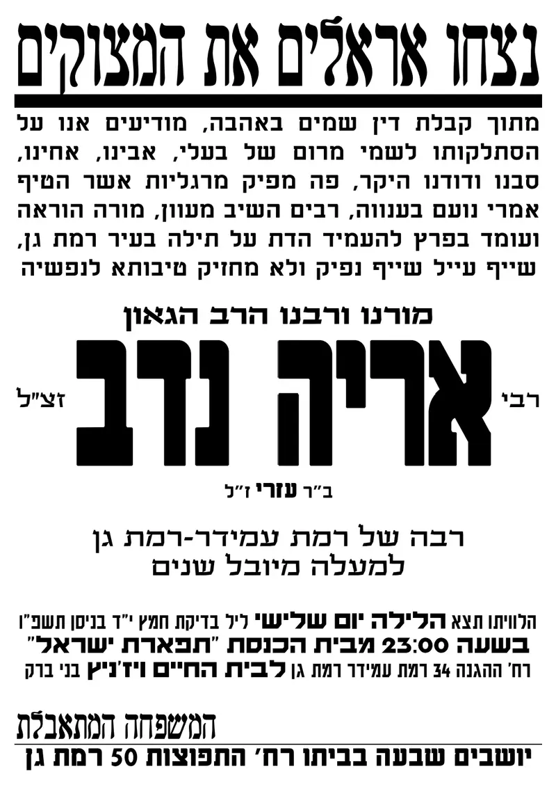 הערב (שלישי) ליל בדיקת חמץ, התקבלה הבשורה הקשה על הסתלקותו של הגה"צ רבי אריה נדב זצ"ל, רבה של שכונת רמת עמידר ורב בית הכנסת "תפארת ישראל" במשך עשרות שנים.
