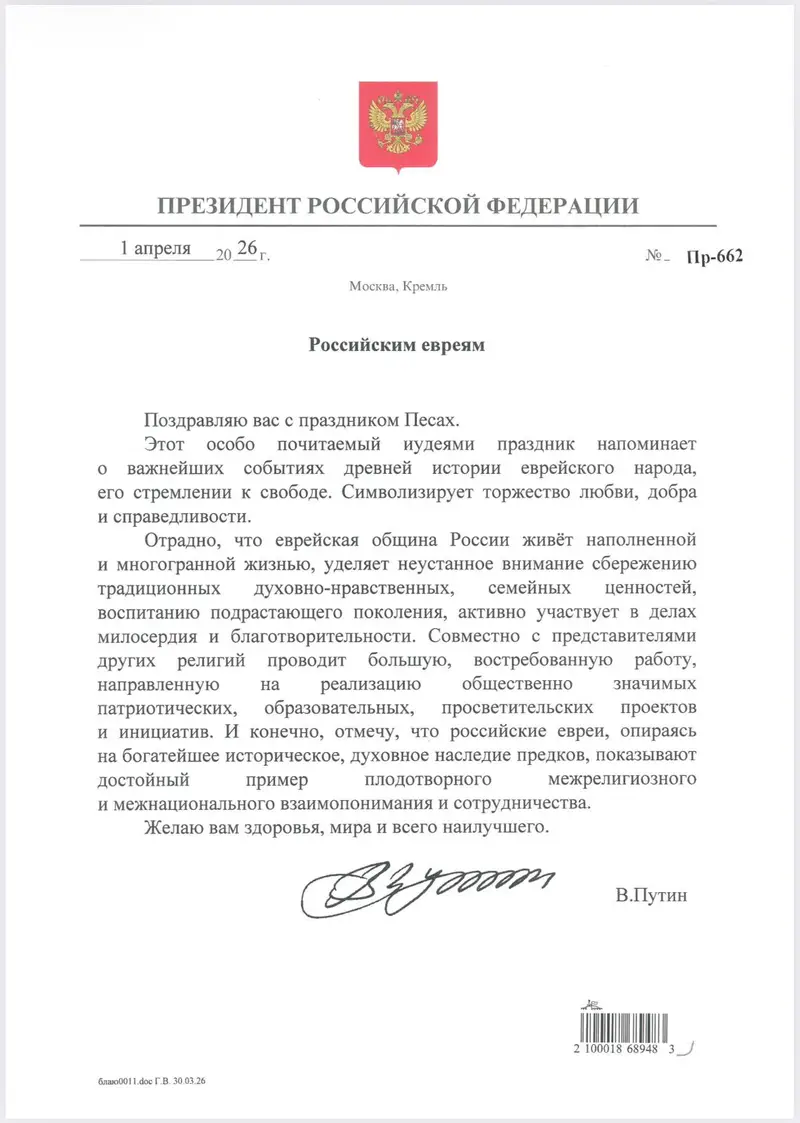 כמדי שנה, שיגר נשיא רוסיה ולדימיר פוטין אגרת ברכה מיוחדת לרבה הראשי של רוסיה הגאון רבי בערל לאזאר, לרגל חג הפסח. האגרת תוקרא הערב בפתיחת 'הסדר הציבורי' המרכזי בבית הכנסת "מארינה רושצ'ה" במוסקבה.
