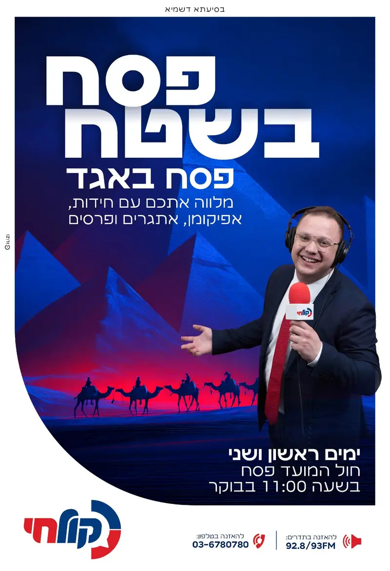 גם במלחמה, התוכנית האהובה חוזרת: הבוקר ב-11:00 בדיוק ב'קול חי', פסח באגד עם תוכנית הבוקר המיוחדת 'פסח בשטח', שיחות עם מאזינים, חידות ומשחקים, והמון לכל המשפחה.