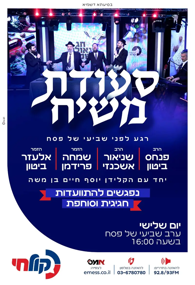 עולם התורה והנגינה היהודית מתאחד למשדר מיוחד תחת הכותרת "סעודת משיח", רגע לפני כניסת החג של שביעי של פסח. האירוע שיועבר בשידור ישיר להאזנה ב'קול חי' ולצפייה בכאן באתר 'אמס' נועד להעניק למאזינים ולצופים שעות של התעלות רוחנית וחיבור פנימי לציפייה לגאולה השלמה. המשדר ילווה בהסברים עמוקים על משמעות היום ובניגוני התעוררות המאפיינים את סיום ימי החג.