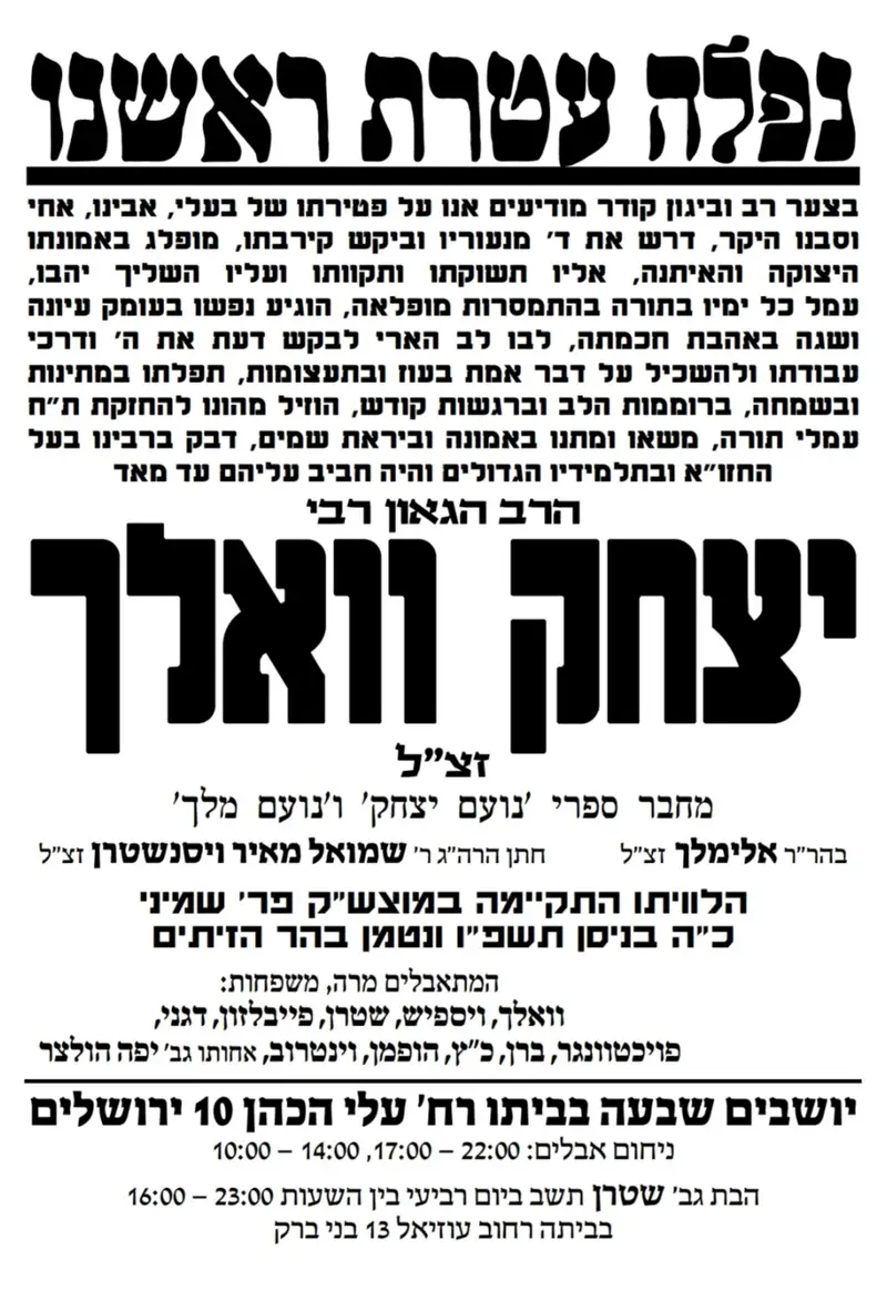 ירושלים מרכינה ראש עם פטירתו של הגאון הנודע הרב יצחק וולך זצ"ל, מהדמויות המיוחדות והמוכרות בעיר, אב ל־20 ילדים ומי שנחשב לדמות ירושלמית אייקונית.