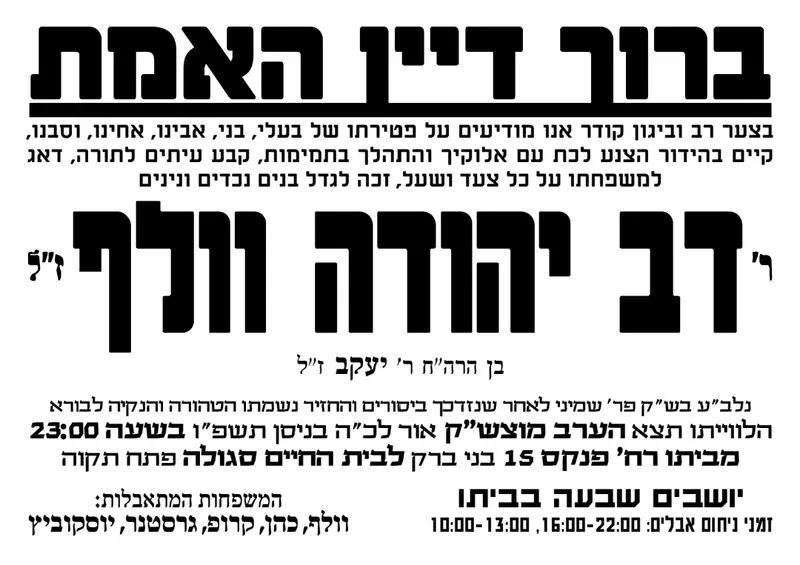 בשבת נפטר הרב דב יהודה וולף ז"ל, שנטמן בבית החיים סגולה בפתח תקווה. השבעה מתקיימת בביתו ברחוב פנקס 15.
