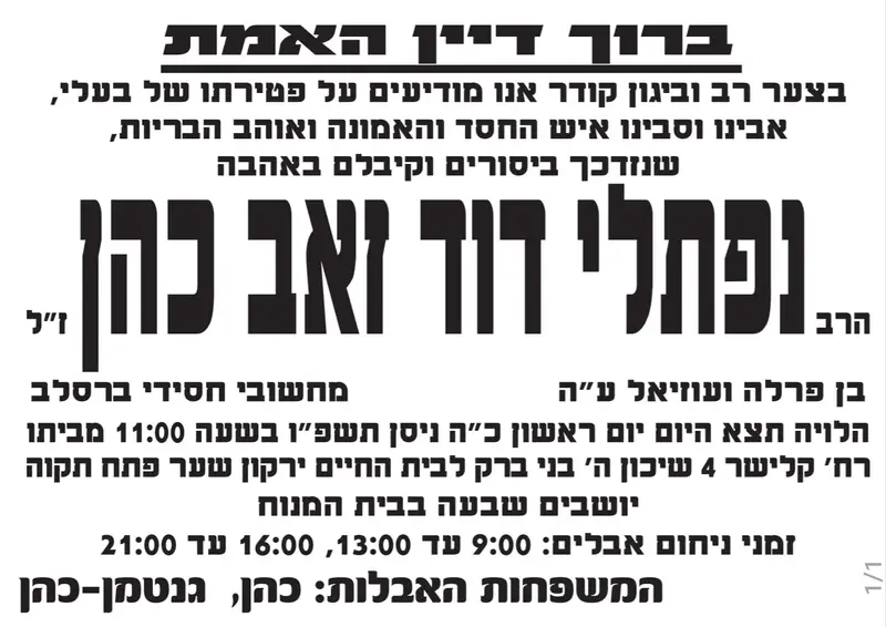 בני ברק חווה יממה קשה במיוחד, עם פטירתם של שבעה מזקני וחשובי תושביה. הבוקר (ראשון) הלך לעולמו הרב נפתלי דוד זאב כהן ז"ל, מחסידי ברסלב. הוא נטמן בבית החיים ירקון, והמשפחה יושבת שבעה בביתו ברחוב קלישר 4 בעיר.