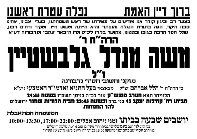 סמוך לכניסת השבת נפטר גם הרה"ח ר' משה מנדל גלבשטיין ז"ל, מזקני חסידי נדבורנה, בן 87. הוא ייצר במשך שנים את מעות "חנוכה געלט" לאדמו"רים. הוא נטמן בהר המנוחות, והשבעה בביתו ברחוב קהילות יעקב 15.