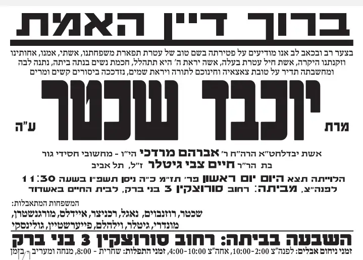 מוקדם יותר היום נפטרה מרת יוכבד שכטר ע"ה, אשת הרה"ח אברהם מרדכי שיבדלחט"א, מחסידי גור. היא נטמנה בבית החיים באשדוד, והשבעה מתקיימת בביתה ברחוב סורוצקין 3.