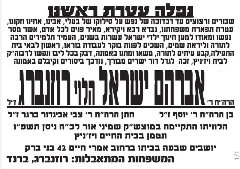 הרה"ח אברהם ישראל הלוי רוזנברג ז"ל, מחסידי ויז'ניץ, בן 78, נפטר אף הוא. במשך 50 שנה חינך אלפי ילדים בת"ת 'מקור ברוך' סערט ויז'ניץ וזכה לישועה פלאית לאחר עשרים שנות ציפייה כאשר נולדו בן ובת. הוא נטמן בבית החיים ויז'ניץ, והשבעה בביתו ברחוב אמרי חיים 42.