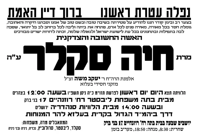 גם מרת חיה סקלר ע"ה, בת 92, אלמנת הרב יעקב משה זצ"ל מחסידי בעלזא ואמו של העסקן הרפואי הרב ראובן סקלר הי"ו, הלכה לעולמה. היא נטמנה בהר המנוחות, והשבעה בבית בתה ברחוב רוזנהיים 17.