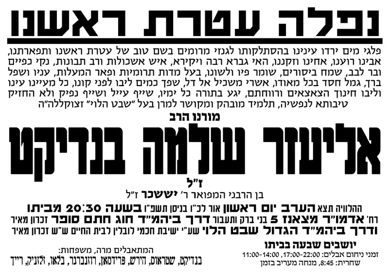 בנוסף נפטר היום הרה"ח ר' אליעזר שלמה בנדיקט ז"ל מחשובי חסידי חוג חתם סופר. הלוויתו יצאה הערב בשעה 20:30 מביתו רח' אדמו"ר מצאנז 5 בני ברק, עברה דרך ביהמ"ד חוג חת"ס זכרון מאיר ודרך ביהמ"ד שבט הלוי ברח' וילקומירר לבית החיים שומרי שבת זכרון מאיר. יושבים שבעה בביתו.