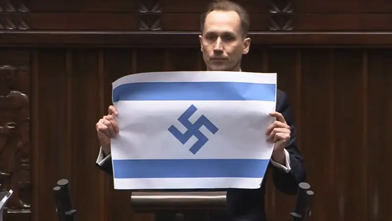 עימות חריף התפתח היום בפרלמנט של פולין, לאחר שחבר הפרלמנט קונרד ברקוביץ' ממפלגת הקונפדרציה עורר סערה במהלך נאום טעון. בשלב מסוים הציג ברקוביץ' דגל ישראל שעליו הוטבע סמל צלב קרס – מעשה שעורר תגובות נזעמות באולם.