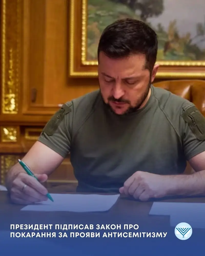 נשיא אוקראינה וולודימיר זלנסקי חתם על חוק תקדימי, מספר 2037, המגדיר לראשונה אחריות פלילית מלאה על מעשים אנטישמיים במדינה מאז נפילת המשטר הקומוניסטי. החוק החדש יוצר מדרג ענישה ברור, ומאפשר להטיל על עבריינים עונשי מאסר של שנים ארוכות בהתאם לחומרת המעשה.