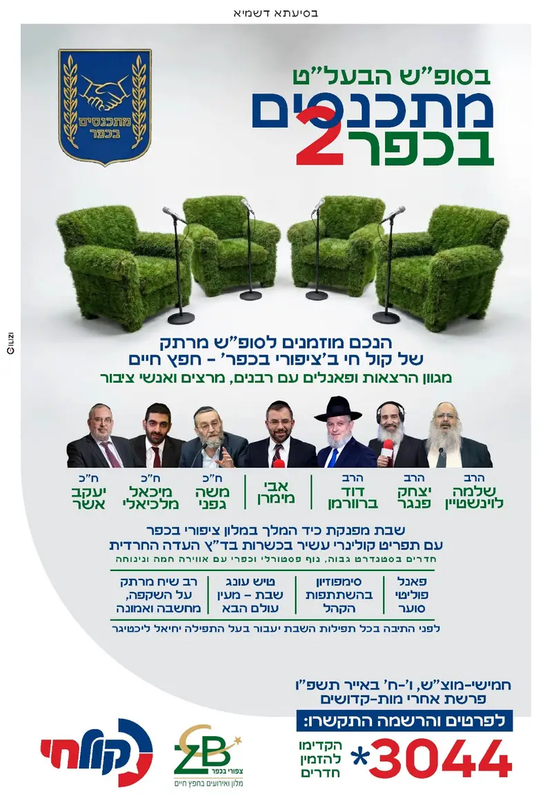 ממשיכים במסורת ומזמין את הציבור לסוף שבוע ייחודי של תוכן ואיכות תחת הכותרת "מתכנסים בכפר 2". האירוע, שיתקיים לאורך שבת קודש פרשת אחרי מות-קדושים (ו'-ח' באייר תשפ"ו), ממש השבוע, יארח במלון "ציפורי בכפר" שבחפץ חיים נבחרת מרשימה של מרצים ואנשי ציבור. המשתתפים ייהנו מנוף פסטורלי, חדרים בסטנדרט גבוה ותפריט קולינרי עשיר בכשרות המהודרת של בד"ץ העדה החרדית.