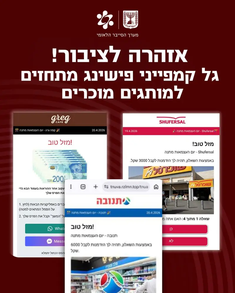 מערך הסייבר הלאומי מפרסם אזהרה חריפה מפני גל הונאות חדש, במסגרתו מופצים קישורים זדוניים המתחזים למותגים ישראליים מוכרים ומציעים מבצעים ומתנות לקראת יום העצמאות.