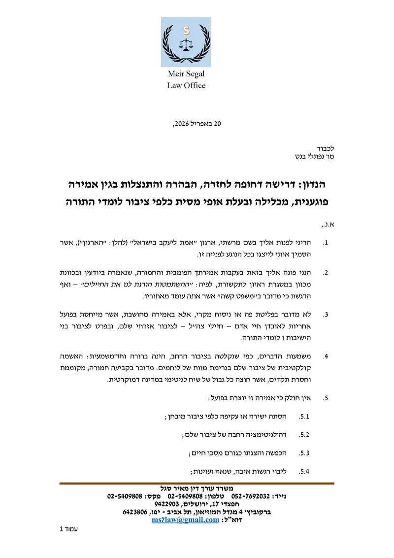 בארגון מזהירים כי הטלת אחריות על ציבור אחד בלבד “מעמיקה שסעים חברתיים ועלולה להוביל למתחים ואף לאלימות”. הם דורשים מבנט לחזור בו ולהתנצל בפומבי.