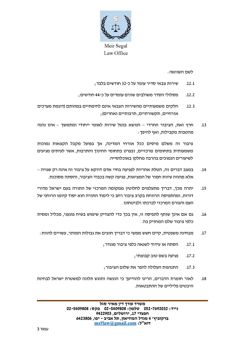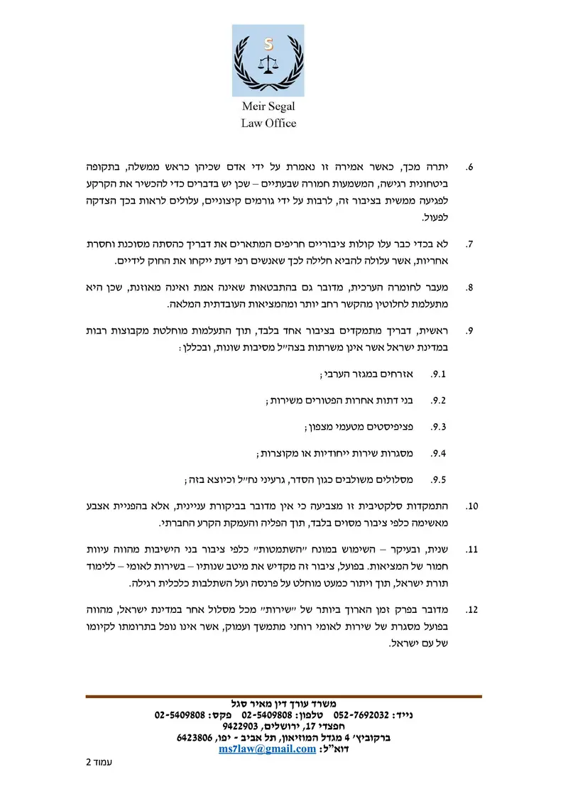 הארגון ציין כי לומדי התורה מחויבים למסגרת לימודית של כ־108 חודשי לימוד, שלטענתו מהווים “שירות לאומי מתמשך” ללא אפשרות לעבודה וללא זכויות מקבילות למסגרות שירות אחרות. לדבריו, יש להכיר בתרומתם הייחודית של לומדי התורה ולא להציגם כגורם הפוגע בביטחון המדינה.