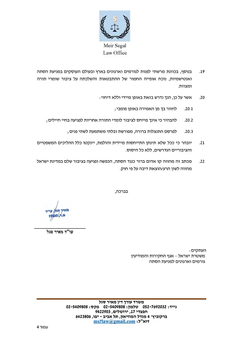 בנוסף לתלונה שהוגשה, הארגון שוקל פנייה לבחינת היבטים משפטיים נוספים ואף לארגונים בינלאומיים העוסקים במניעת הסתה.