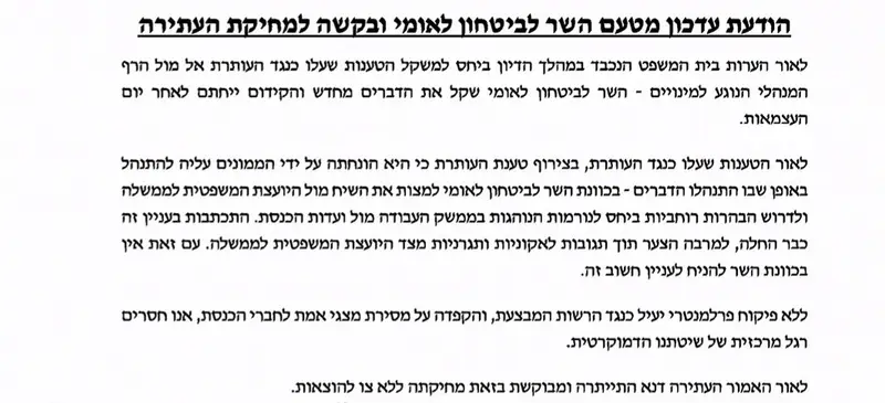 בהודעת המדינה לבית המשפט נכתב כי בן גביר שקל מחדש את עמדתו בעקבות הערות השופטים בדיון, שהדגישו את הפער בין הטענות שהועלו נגד הקצינה לבין הרף המנהלי המקובל במינויים. על פי ההודעה, הקידום ייחתם לאחר יום העצמאות.