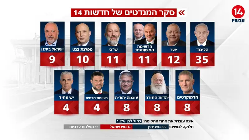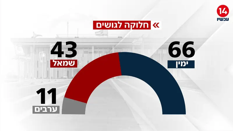 בפילוח הגושים עולה כי לגוש הימין 66 מנדטים, בעוד גוש המרכז-שמאל עומד על 43 מנדטים, והמפלגות הערביות יחד עם 11. הפער בין הגושים מדגיש את היתרון של מחנה הימין בתמונת המצב הנוכחית.