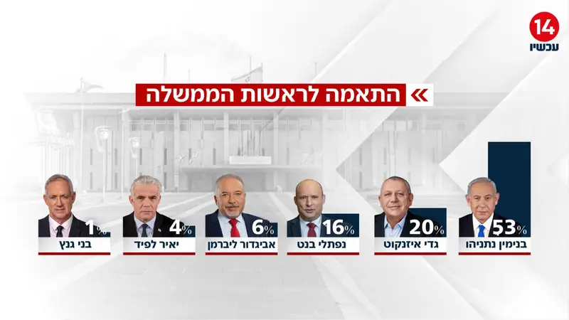 בשאלת ההתאמה לראשות הממשלה, נתניהו מוביל בפער ניכר עם 53% תמיכה. אחריו איזנקוט עם 20%, ובמקום השלישי בנט עם 16%. שאר המועמדים זוכים לתמיכה נמוכה יותר: ליברמן עם 6%, יאיר לפיד עם 4% וגנץ עם 1% בלבד. הסקר נערך בקרב 958 משתתפים בכלל האוכלוסייה בתאריך 23 באפריל 2026, ונותח על ידי שלמה פילבר.