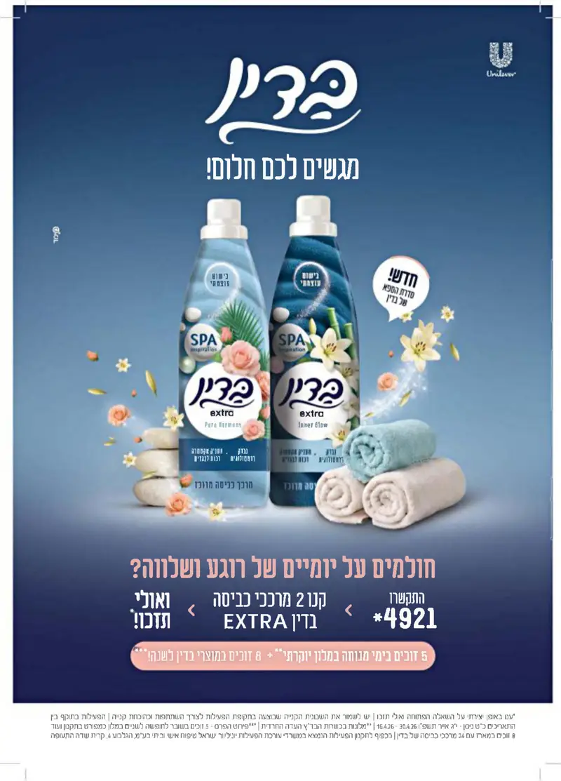 'בדין', לעומת זאת, באמצעות משרד הפרסום 'מימד', מחברים את הרוגע והשלווה דרך מרככי כביסה עם הגרלה על חופשה יוקרתית הבטחה לחופשה – חיבור יפה בין המוצר למתנה שלהם.